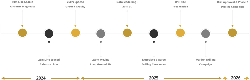 The drilling programme tests a 4 km × 2 km geophysical target interpreted as an Intrusion-Related Gold System (IRGS), defined through integrated 3D gravity and magnetic modelling, and further refined by Induced Polarisation (IP) and Electromagnetic (EM) survey data. Initial drilling will be done with a phased approach designed to incorporate geological results into ongoing targeting.
