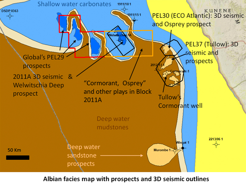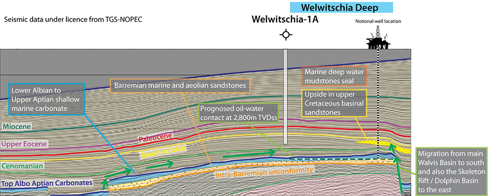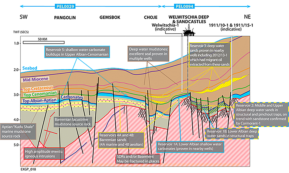 - Welwitschia-1A well drilled in western part of PEL0094 in 2014, targeted Upper Cretaceous sandstones, which were absent at this location, but the well proved excellent seals.