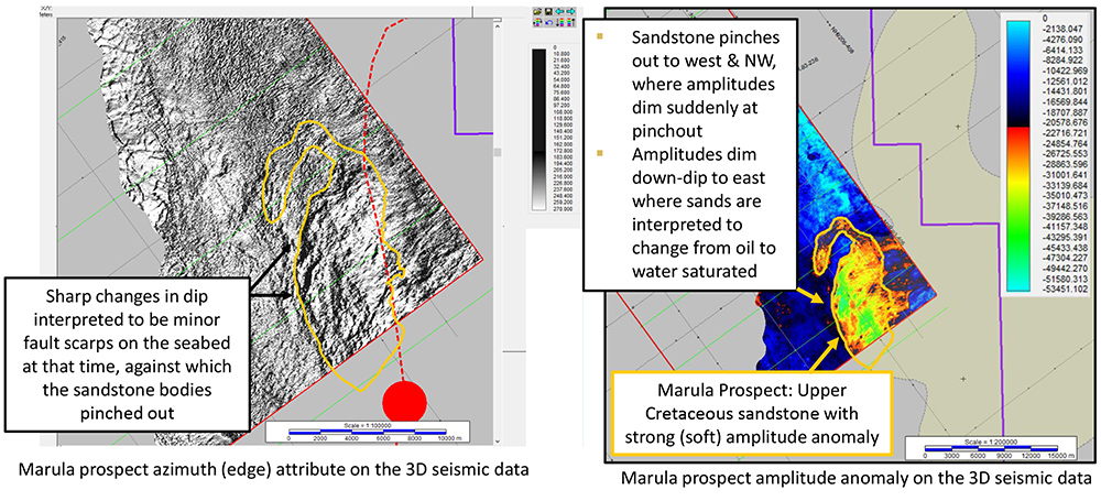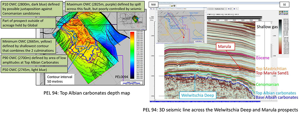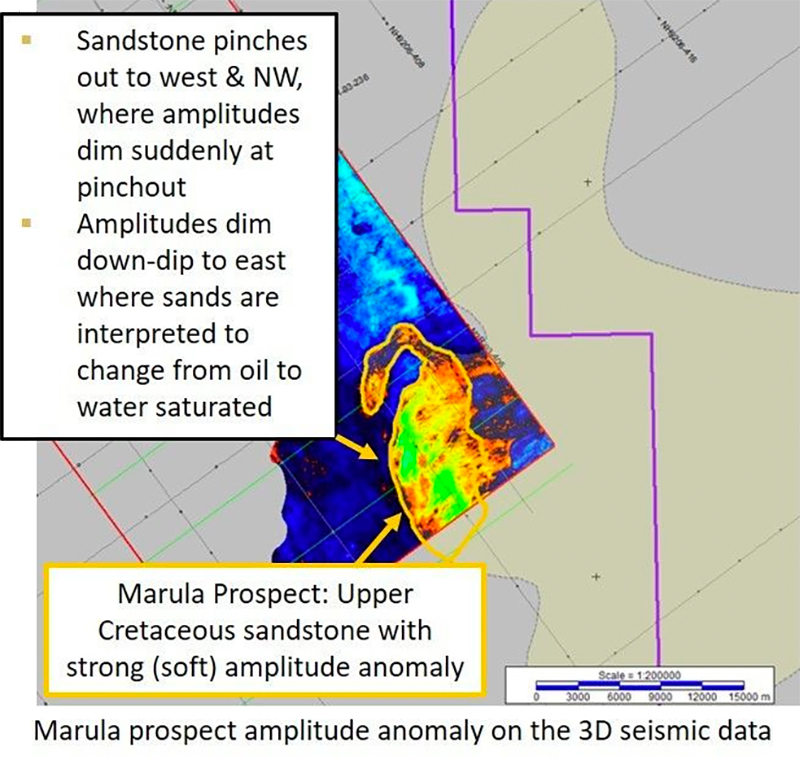 Within the area of the 3D seismic data survey in PEL0094, the Marula prospect has been mapped with Upper Cretaceous sandstones in a distal pinchout trap. There is a strong amplitude anomaly whose edge conforms to structure down-dip, and this edge could be an oil-water contact. As such, GEO considers this to be the most attractive of its prospects. The forward plan is to work up existing data and other data yet to be licensed to showcase this potential, and then partner with a credible deep water operator to move the exploration of the two licences forward.